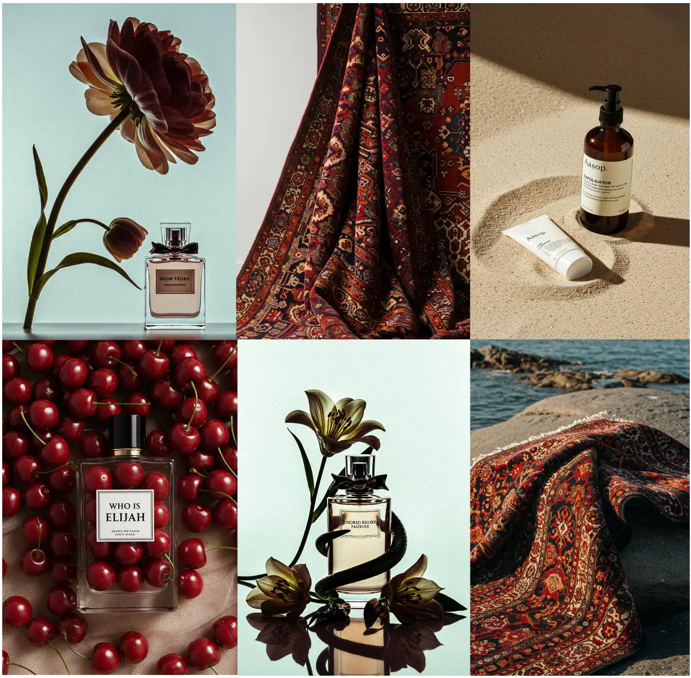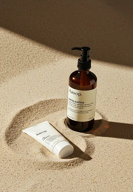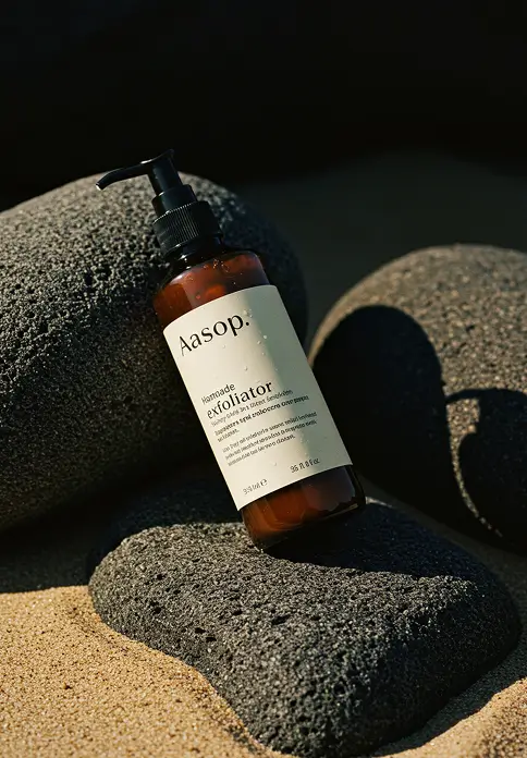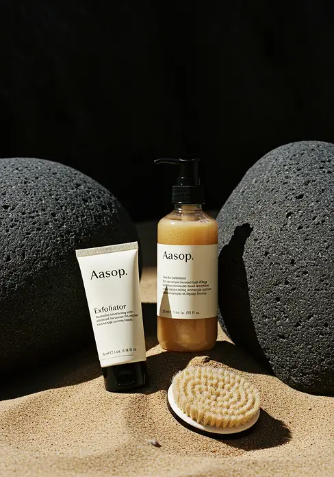 The high-end organic brand Aesop is renowned for its minimalistic approach, creating products that prioritise safety and efficacy. The visual design emphasises clean compositions, showcasing products within setups inspired by natural elements while removing distractions, ensuring the product remains the central focus.