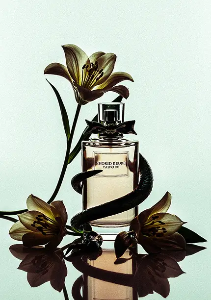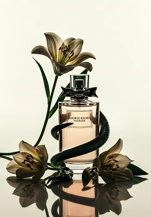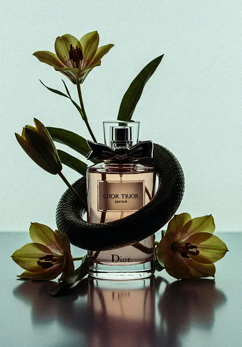 The creative direction for Dior focuses on capturing the perfume’s dual personality: the delicate, floral scent and the subtly dangerous, seductive allure. The concept showcases a playful interplay between snakes and flowers, gently wrapping around the bottle, highlighting both beauty and intrigue. Bright backgrounds contrasted with darker foreground elements enhance the whimsical, enchanting feel of the shots, creating a visual narrative that reflects the fragrance’s complexity.